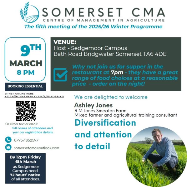 Somerset CMA will welcome Ashley Jones of R M Jones, Smeaton Farm, who will present a talk entitled “Diversification and Attention to Detail.”