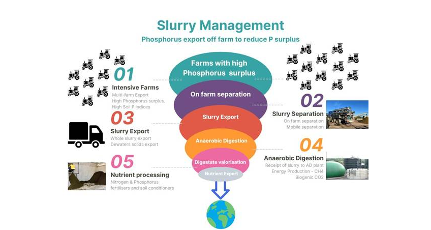 One promising solution is slurry processing, which offers the opportunity to manage a portion of the surplus P on farms by exporting phosphorus-rich slurry solids to areas which need phosphorus in the UK, Ireland or beyond – enabling farmers to reduce local nutrient loading without cutting productivity.
